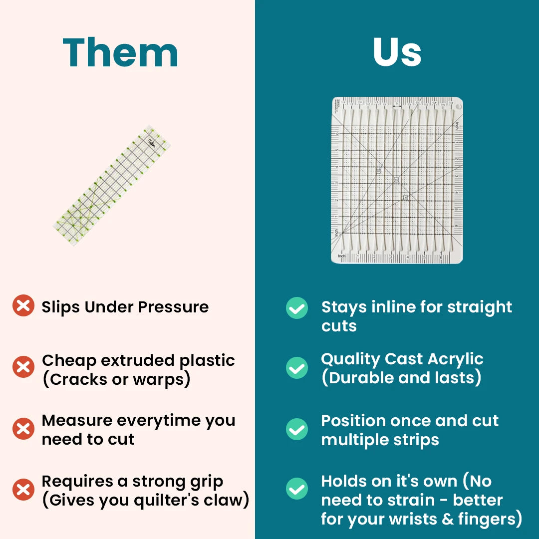 Say goodbye to uneven cuts, wasted fabric, and endless measuring, and hello to professional-looking quilts, fast! The QuiltMaster Cutting Ruler is your all-in-one solution for effortless precision, designed by quilters who get it.